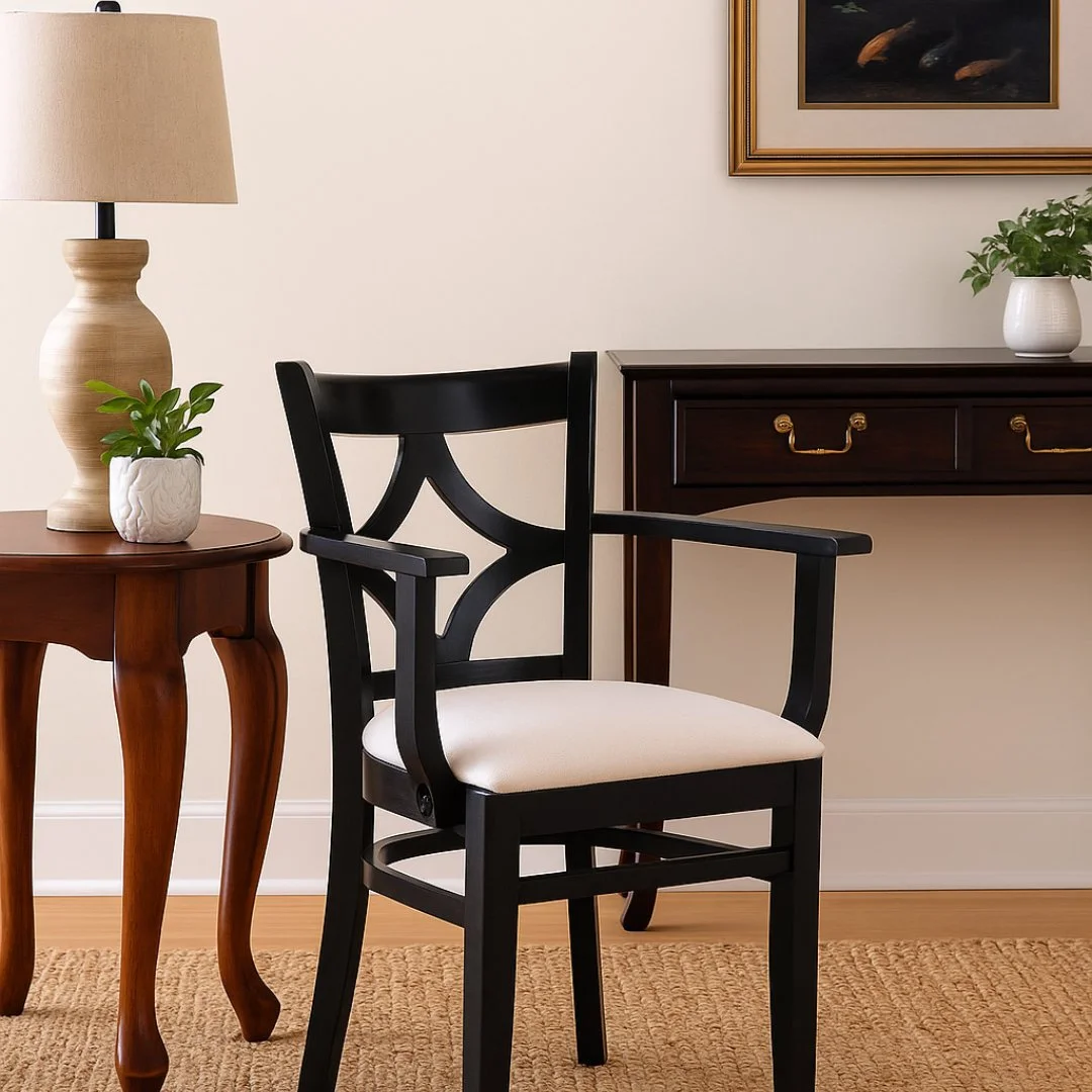 Elevate your space with the sophisticated charm of this dining chair — a striking fusion of classic artistry and modern elegance. Crafted with a bold black wood frame, its sculpted diamond-back silhouette adds a touch of drama to any room, evoking the elegance of art deco design with a contemporary twist.