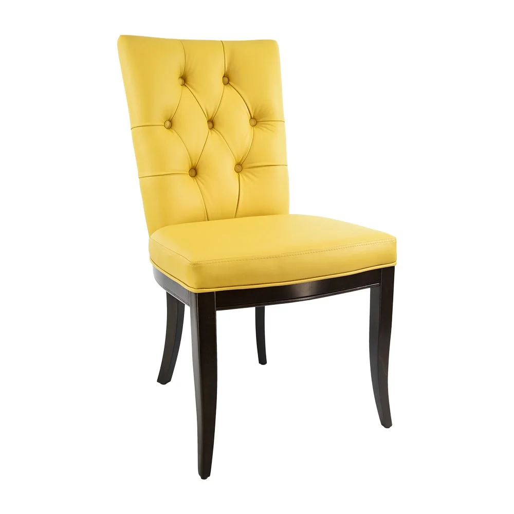 Vibrant yellow leatherette upholstery with elegant button-tufted detailing
