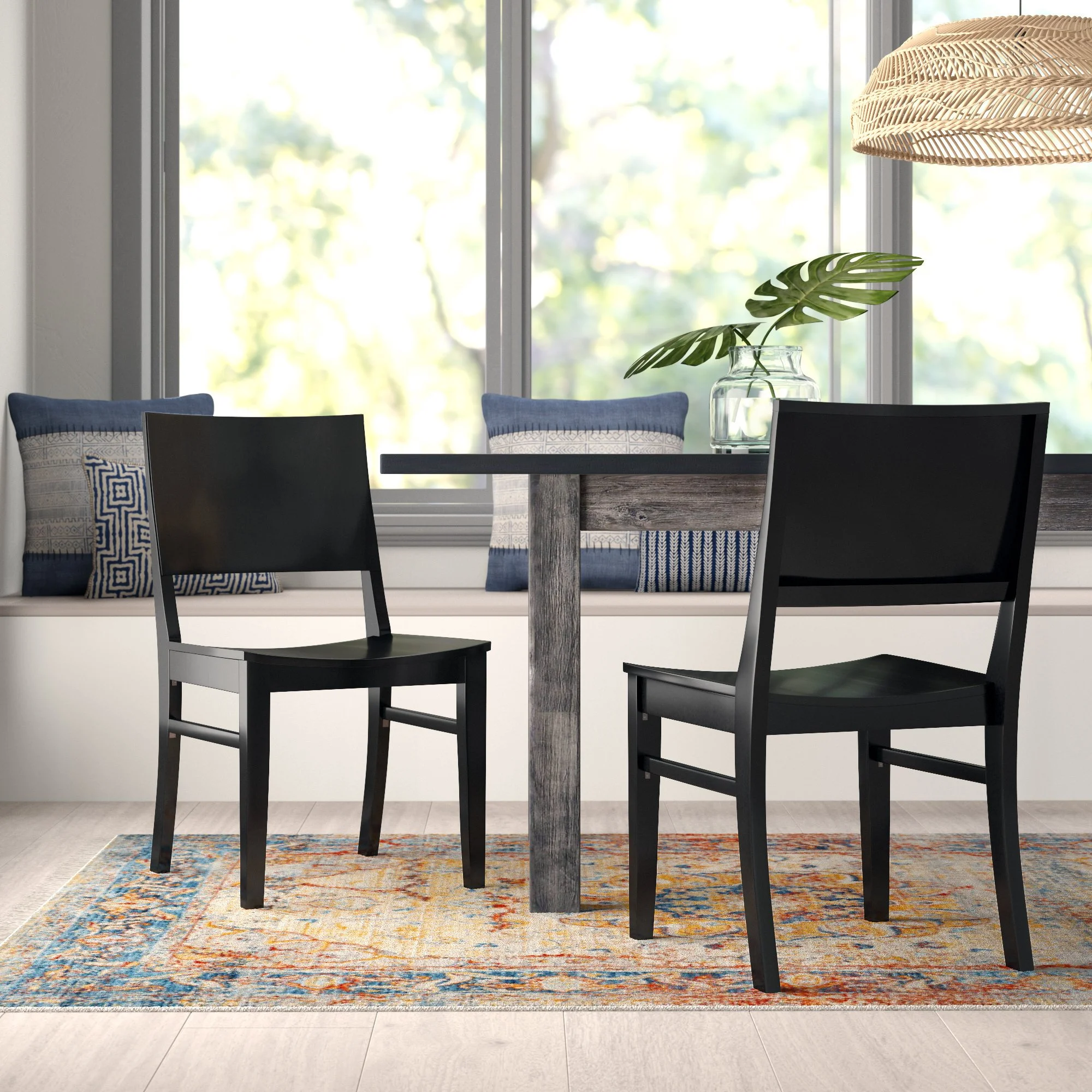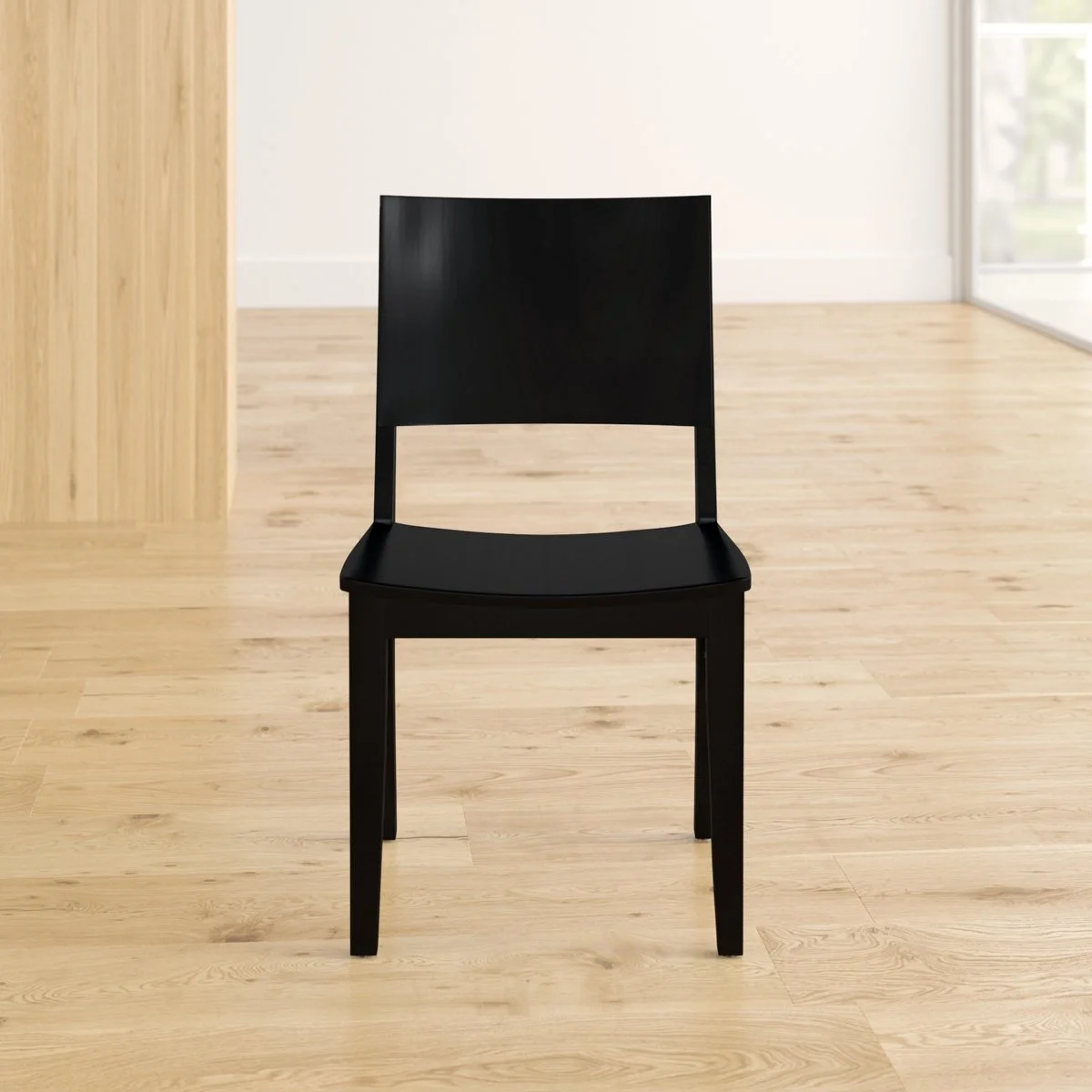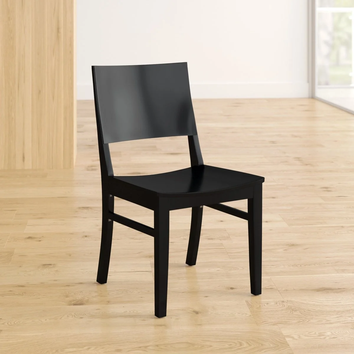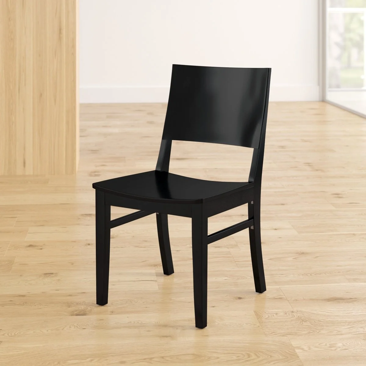 This set includes two side chairs featuring a solid wood frame and legs made from beech wood. Designed with a solid back for support, the chairs do not swivel and are equipped without wheels or casters. Each chair supports up to 350 pounds.