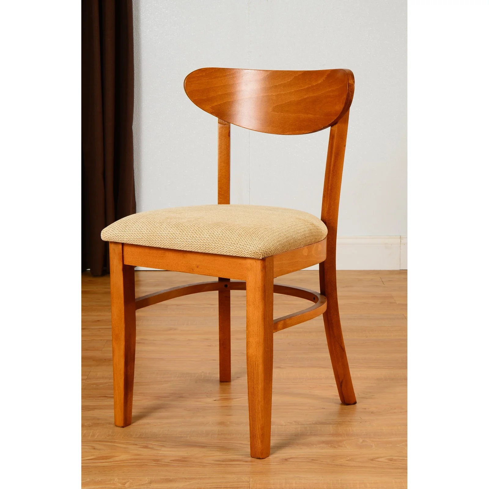 This set includes two upholstered side chairs featuring a solid beech wood frame and legs in a rich cherry finish, with a solid back design, wheat fabric upholstery filled with foam, a 300 lb. weight capacity, and no swivel or casters.