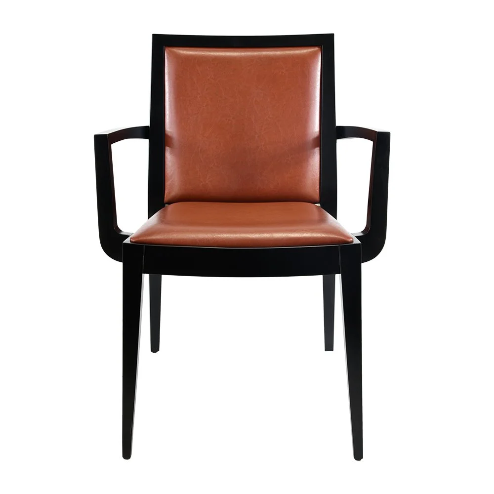 The Ludlow Armchair channels a bold blend of modern minimalism and classic warmth. Its structured black frame surrounds generously padded, saddle-toned faux leather, offering both form and function. With elegantly arched armrests that embrace you and a presence that commands the room, it's a seamless fit for elevated dining spaces, hotel lounges, or executive boardrooms.